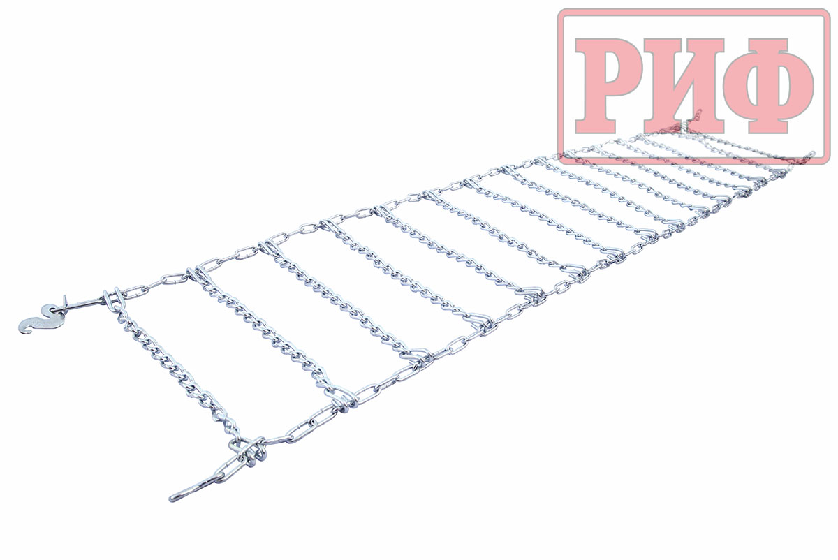 Конструкция из двух продольных цепей по внешнему и внутреннему диаметрам колеса, которые соединяются поперечными цепями. Витые звенья поперечных рабочих частей цепи.
