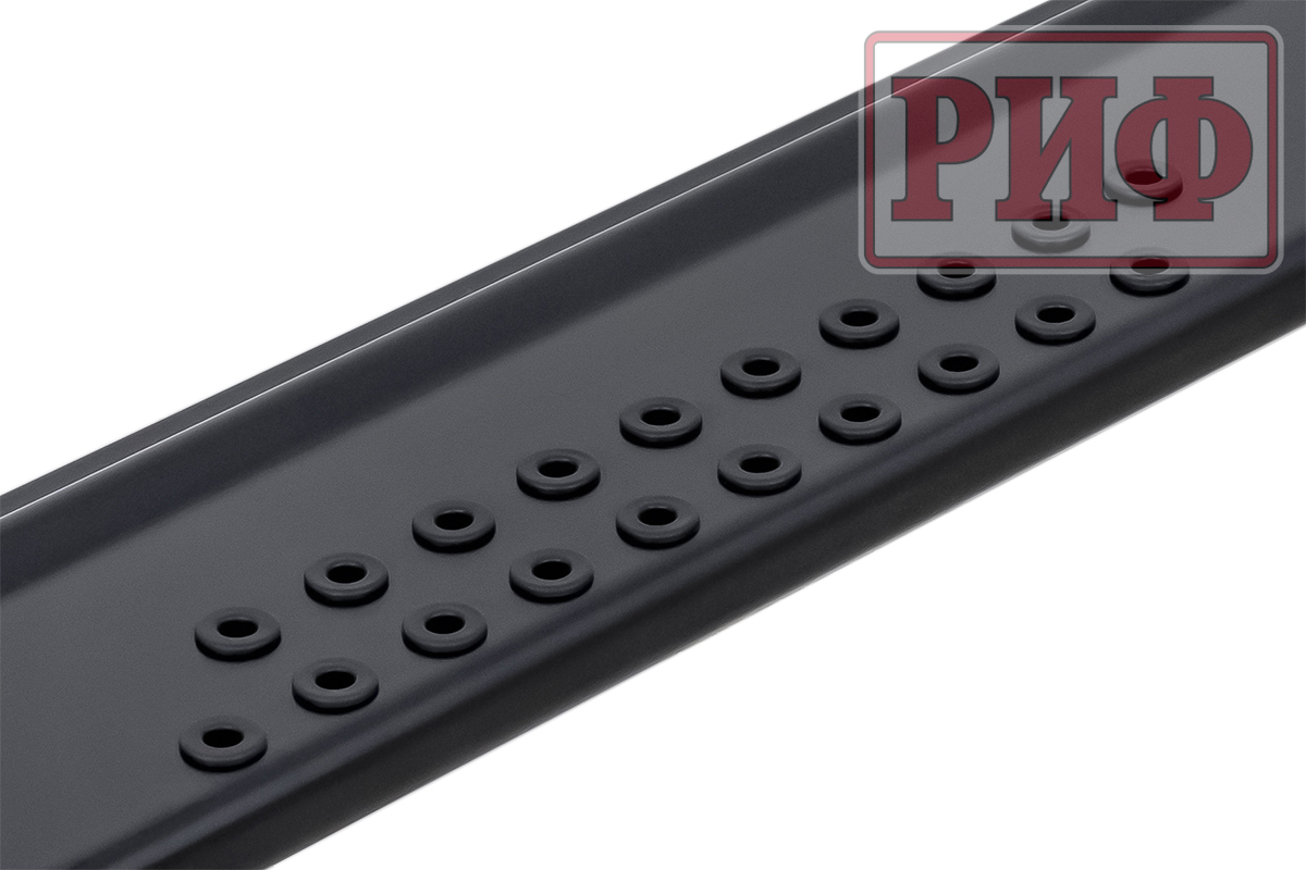 Новые пороги РИФ идеально вписывается в стиль легендарного внедорожника. Эти пороги внешне отличаются от всех других порогов РИФ необычной формой и накладками против скольжения выполненными не из алюминия, в виде двойных рядов обрезиненных круглых отверстий.