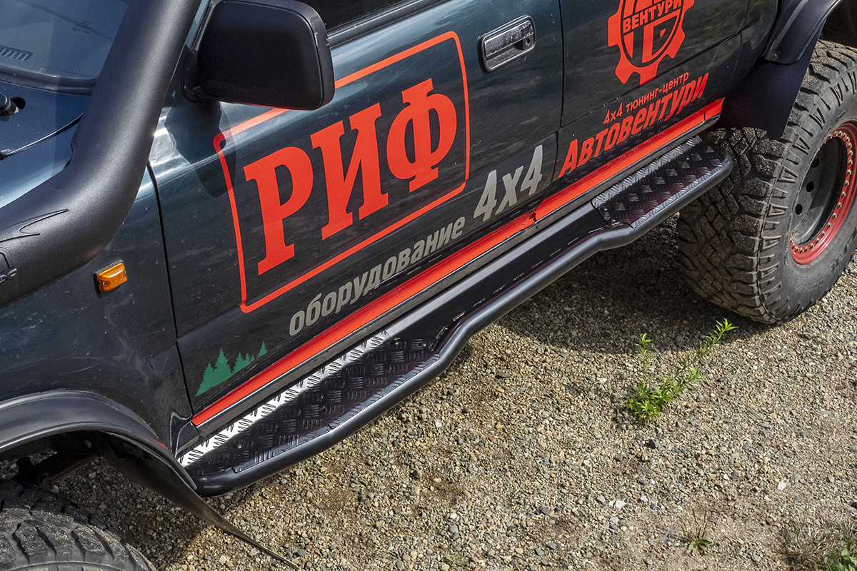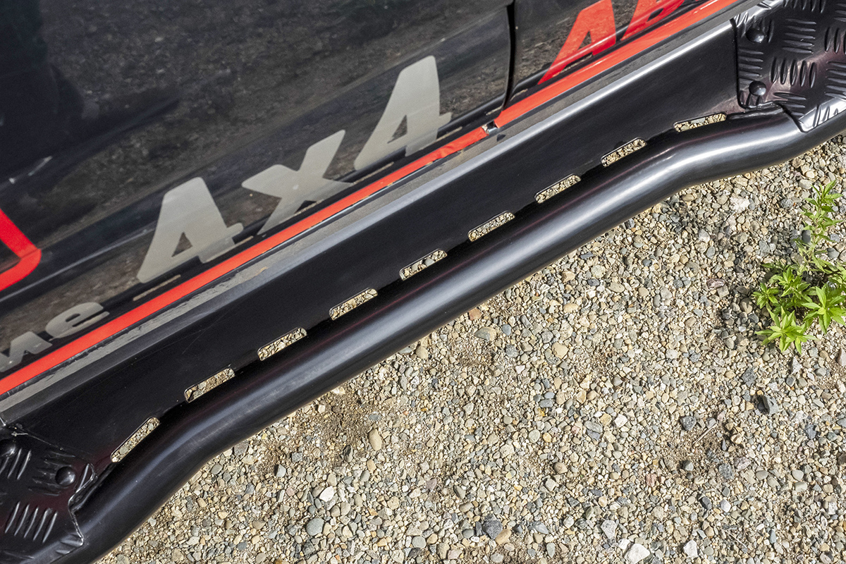 Видимая часть силовых порогов РИФ для Toyota Hilux выполнена из стальной трубы (толщина стенки 2,5 мм, диаметр — 51 мм), сверху — накладка из рифленого алюминия. Пороги не портят внешний вид автомобиля, органично вписываясь в экстерьер, благодаря продуманному дизайну.